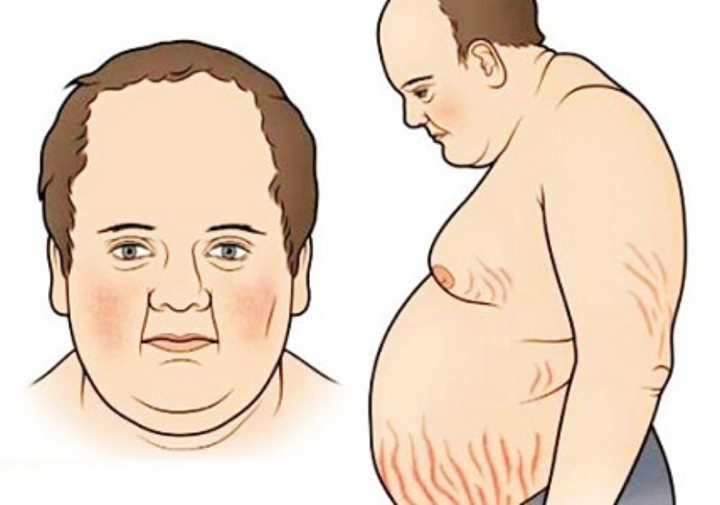 Kuşinq Sindromunun Simptomları: Üz və boyunda yuvarlaq və qırmızı "ay üzü" Qarın nahiyəsində, ...