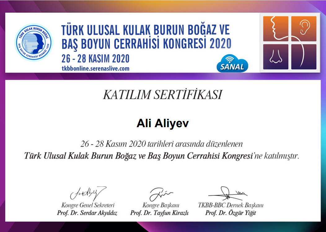 Uzman Doktor Əli Əliyev Qulaq Burun Boğaz Xəstəlikləri - LOR Cerrah ekspertidir. Burun və Qulaq cerrahiyyəsi, Estetik əməliyyatlar, Boyun Cerrahiyəsi və Qulaq ,burun,boğaz endoskopik və mikroskopik müayinəsi, xəstəliklər sahəsində xidmətlər göstərir.